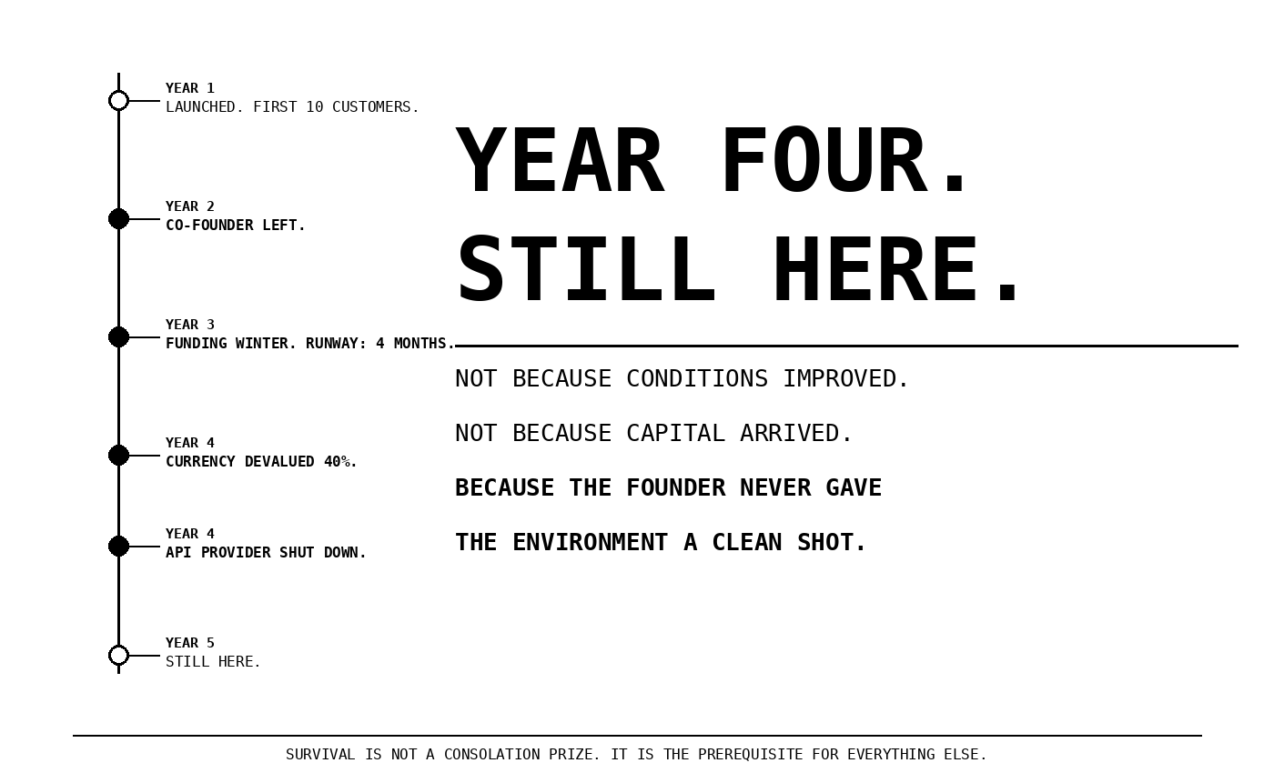 There is a type of founder who does not appear in the origin stories that get written up. They do not raise large rounds. They do not feature in "30 under 30" lists before they have built anything. What they do is stay in the game, month after month, in markets that regularly test whether they should.