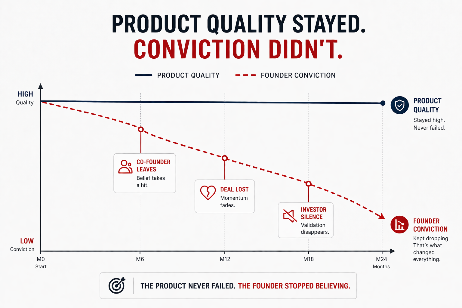 I now think most of that silence was not about the product. It was about the fact that I walked into those rooms with a conviction I had not actively maintained. I had stopped doing the work of selling myself on Pasella every day. I assumed the conviction from two years earlier would hold, and it did not.
